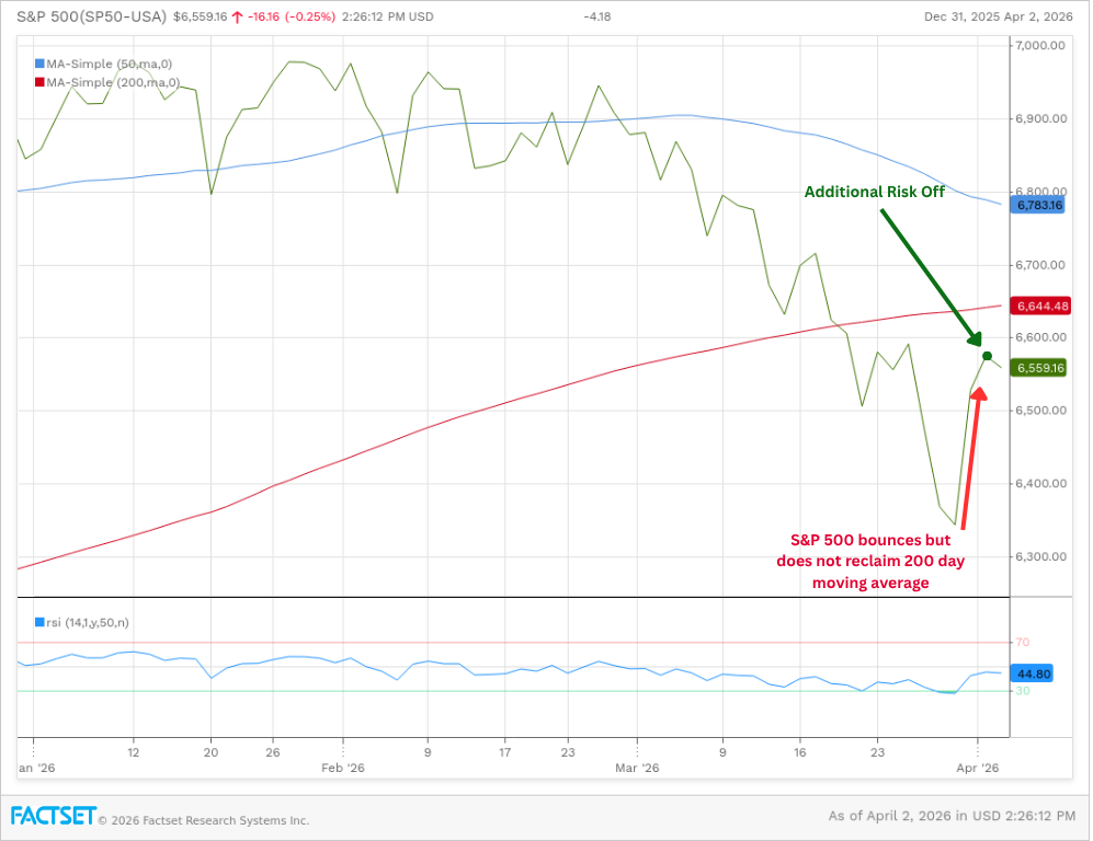 The S&P 500 is trading below its 200-day moving average, which is a widely followed indicator of long-term trend health. Historically, sustained trading below this level is associated with continued weakness rather than a quick recovery. The recent bounce we saw on April 1st moved us back toward — but not through — that line. That is a meaningful distinction. A market that cannot reclaim its 200-day moving average on a bounce is telling us the sellers are still in control.